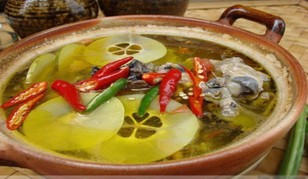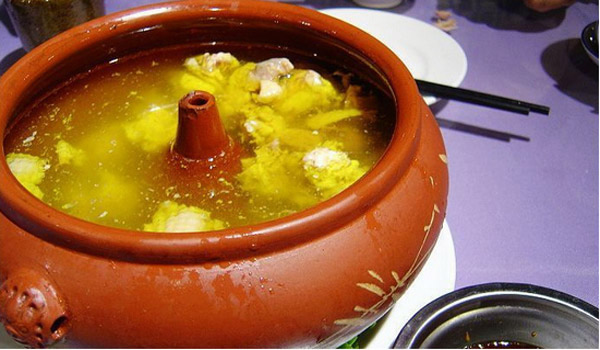 云南具有獨(dú)特風(fēng)味的滋補(bǔ)名菜,其做法是先將三七細(xì)根用清水浸泡洗凈,裝入已清洗干凈的雞腹內(nèi),將雞塊置于汽鍋內(nèi),配上佐料,然后放在一只盛有四五公斤水的砂鍋上,將兩鍋接觸處密封,用旺火上燉三、四個(gè)小時(shí),直到雞肉蒸熟,以至肉骨分離。這樣燉出來的雞肉原汁原味,肥嫩鮮香,湯汁鮮甜。...